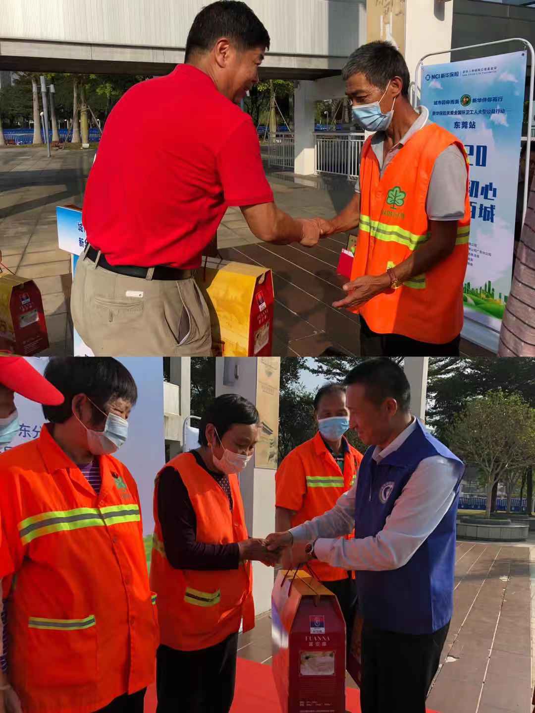 赵立军副总经理和欧智艳副秘书长分别代表新华保险东莞中心支公司和东莞市环境清洁行业协会互赠爱心支票牌匾,与会领导向在场的环卫工人代表们送上慰问品表示敬意。
