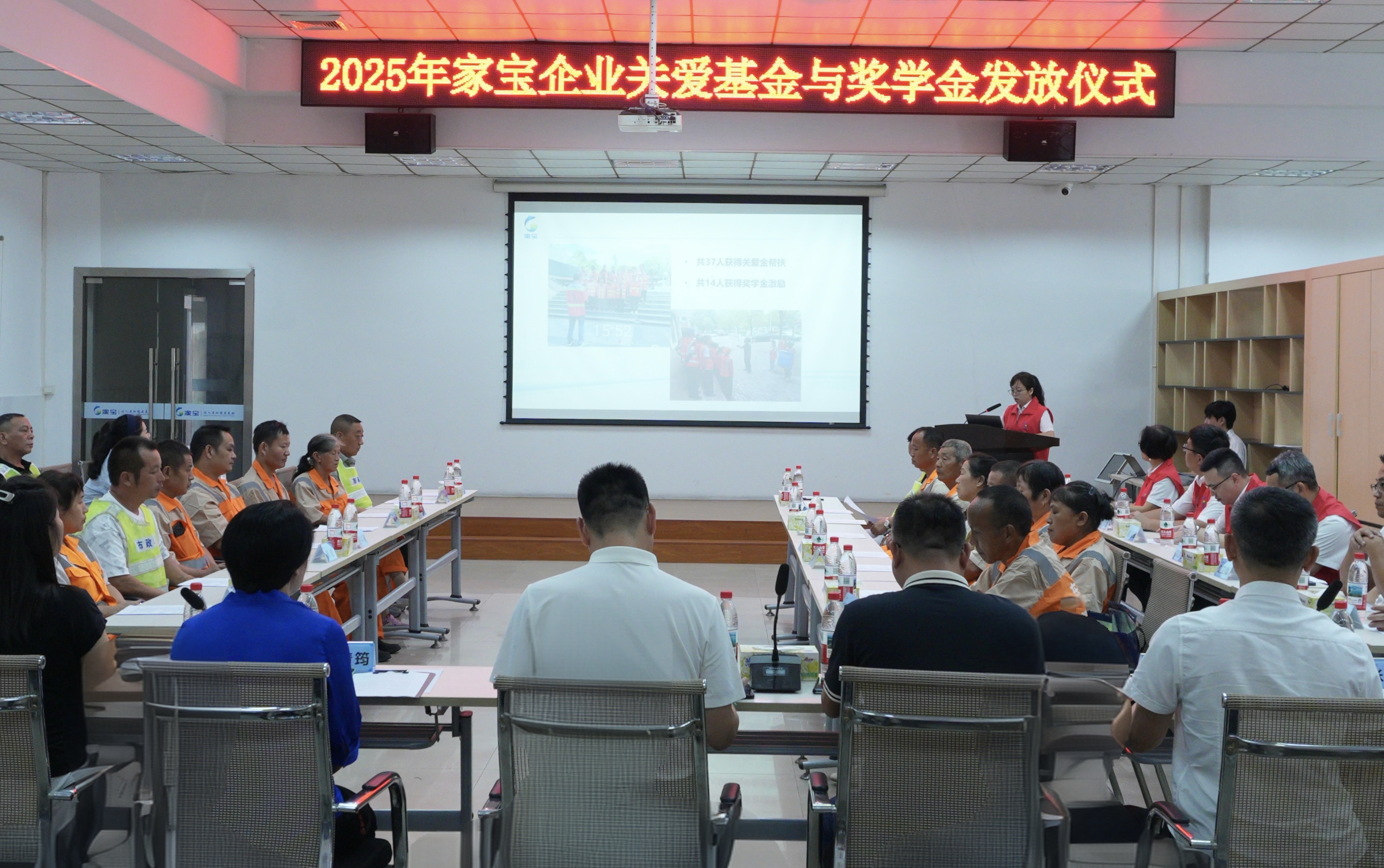 8月18日下午,协会常务副会长单位——东莞市家宝园林绿化有限公司(以下简称“家宝公司”)在公司赤岭办公区多功能厅隆重举行2025年度企业关爱基金与奖学金发放仪式。市城市管理综合执法局市容环卫科三级主任科员黎倩筠,家宝公司总裁王大樑,协会秘书长欧智艳,家宝企业关爱基金管理委员会全体委员、公司相关管理人员以及受助员工代表及其家属等60余人出席活动。